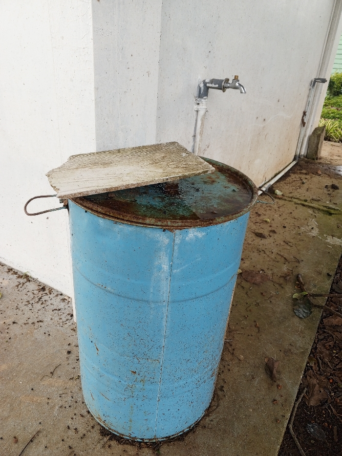 A blue metal barrel sits beside a white wall and faucet. The barrel's top is rusty and covered in water, partially obscured by a broken piece of wood. Its blue paint is chipped and worn, showing signs of age and use. The faucet is mounted on the wall. The ground around the barrel is damp, with scattered leaves and debris. A white door is partially visible in the background, along with some greenery.