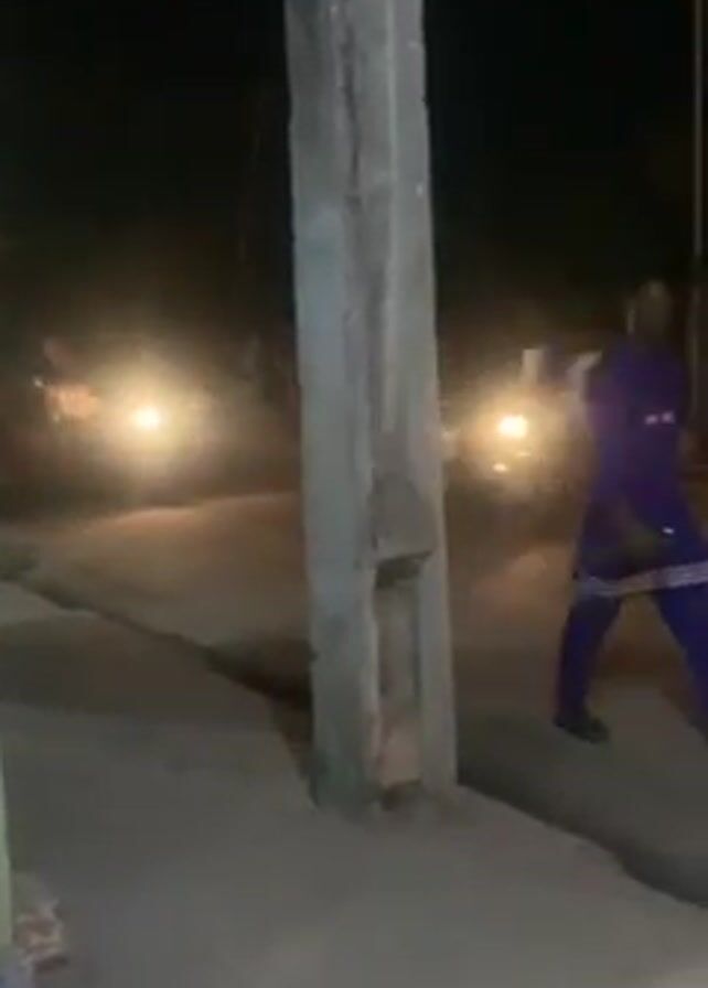 nighttime street scene. A person in a blue tracksuit walks along the sidewalk. Vehicles with headlights on pass by. Further down the street, a group of people is gathered near a small structure and a parked motorcycle. The street is illuminated by streetlights and vehicle headlights. There are concrete poles along the sidewalk.
