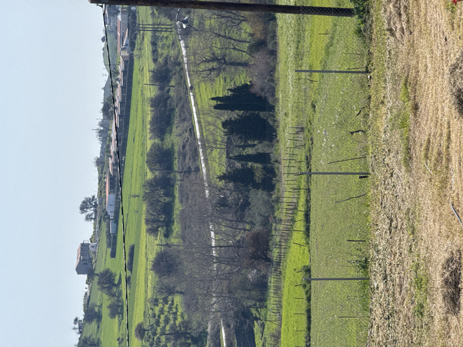 The scene captures a panoramic view of a rural landscape in Alonia, Greece, under a clear, light blue sky. In the immediate foreground, a field of dried, mown grass and sparse green vegetation is observed, with a single small plant visible in the lower-left quadrant. A chain-link fence, supported by vertical metal posts, runs across the lower-mid ground, delineating an area of vibrant green crops that contain scattered white specks. The mid-ground features a winding asphalt road that traverses a gentle valley. This area is populated by a mix of leafless deciduous trees and several dark green evergreen trees, including conical cypresses and what appear to be olive trees. Utility poles supporting overhead power lines are distributed along the road and extend into the distant hills. The background consists of undulating green hills dotted with structures. On the left side, a light-colored, multi-level building with a light-toned roof, appearing partially constructed or in disrepair, is situated on a hillside. To the right, a linear arrangement of multiple smaller buildings, each with a reddish-orange roof, is visible on a higher, distant slope. No individuals, animals, or specific actions are discernible within the frame.
