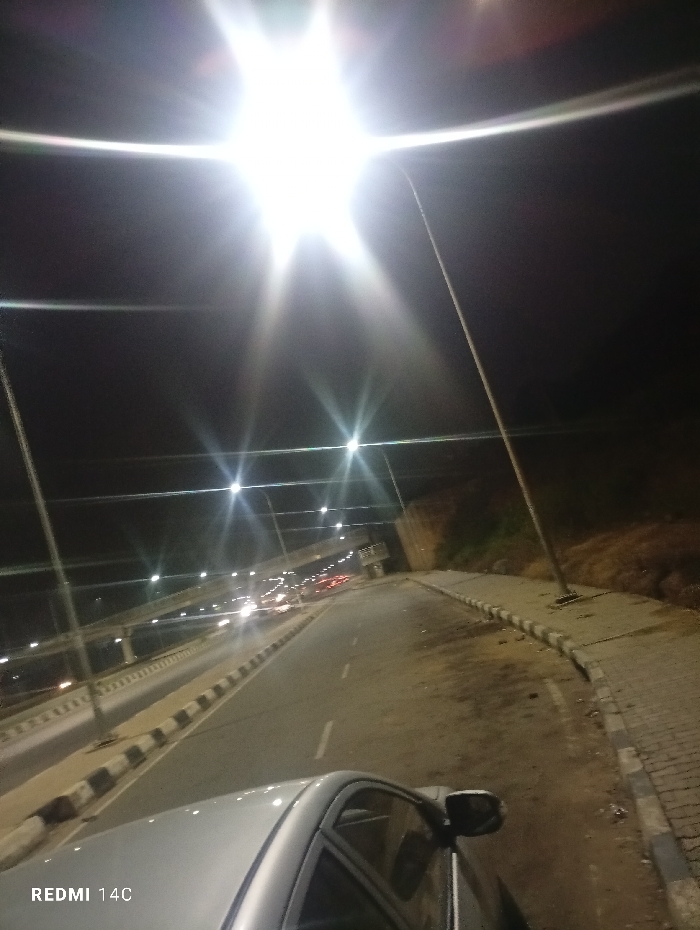 Night view of a lit highway. Bright streetlights illuminate the road and a car's hood is in the foreground. A raised section of the highway is visible with cars driving on it, alongside a pedestrian overpass. One side of the road is defined by black and white curbs and beyond that, a sidewalk. Vegetation is visible in the background, and the sky is dark. The photo was taken with a "Redmi 14C" phone.