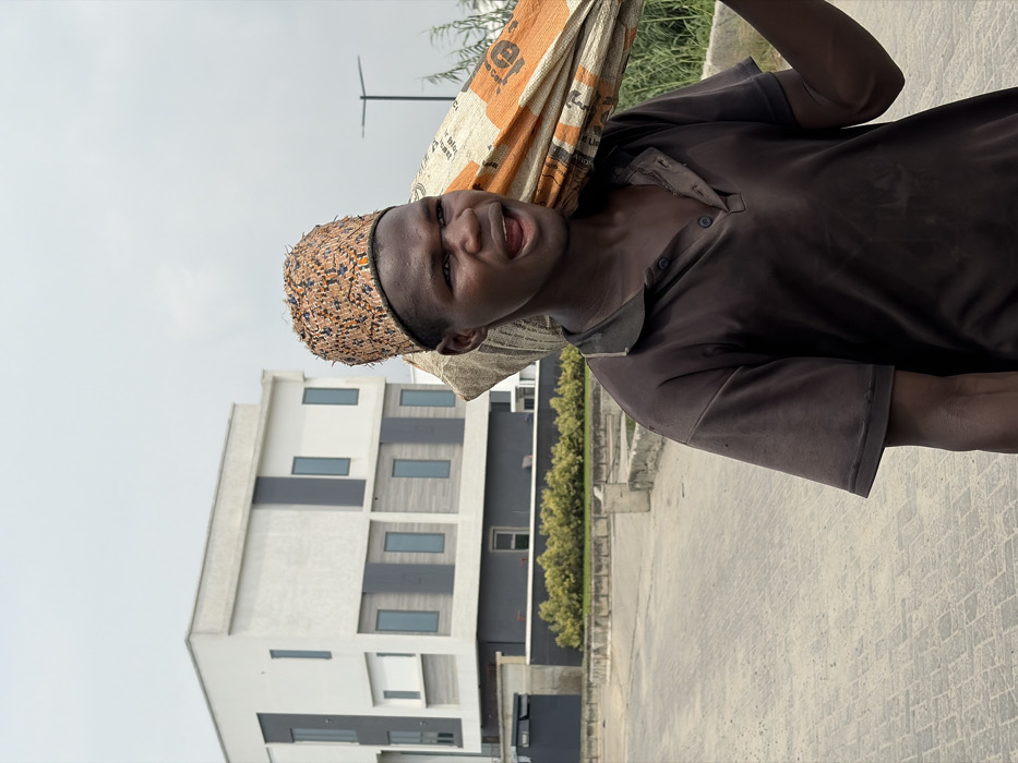 A dark-skinned male, appearing to be a young adult, stands outdoors in Jakande, Nigeria, facing slightly right with his mouth open and eyes narrowed