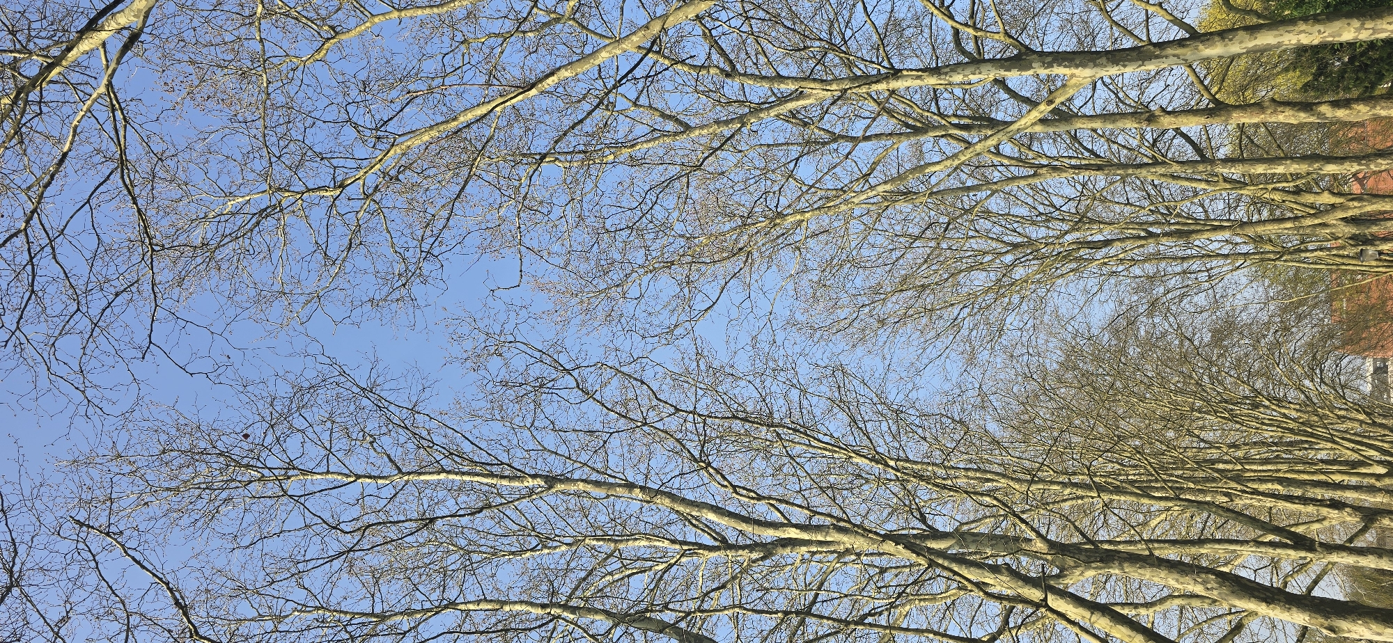 The image presents a vertical, upward-angled view of a tree-lined avenue in Les Ulis, France. Numerous tall, deciduous trees, characteristic of plane trees (Platanus) with their mottled, light-colored bark, dominate the scene. Their branches are bare of foliage, forming intricate patterns against a clear, bright blue sky. The perspective extends down the avenue, showing more bare trees receding into the background. In the lower portion of the image, distant elements are visible, including a reddish-brown building partially obscured by the trees and some green foliage on the right. No individuals, specific actions, or interactions are discernible.