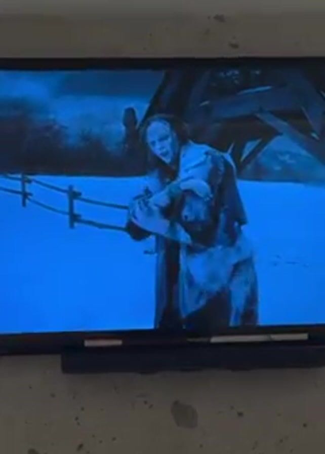 A television screen displays a scene of a person in a wintery landscape. The person, who appears to be male, is wearing a long, tattered coat and has long, dark, wet hair. The person’s face is pale, and they appear distressed, clutching their arm. The background is a snowy scene with a wooden fence and a structure, potentially a building. The entire scene has a blue tint. The television is a Sony model and is mounted on a wall above another electronic device.