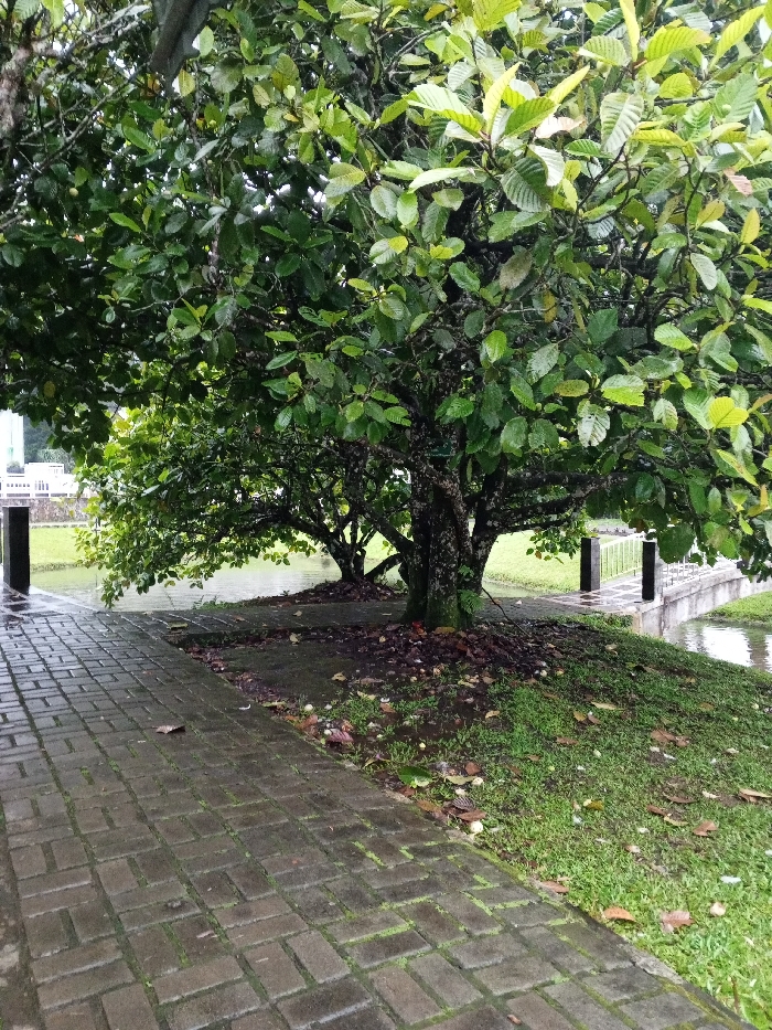 A low-angle shot shows a paved brick pathway alongside a lush green grassy area with trees. The trees have thick, green foliage that creates a canopy. Beneath the trees, the ground is covered with fallen leaves and small fruits. A stream with a small bridge and a fence runs behind the trees. The bricks on the path appear wet, possibly from rain.
