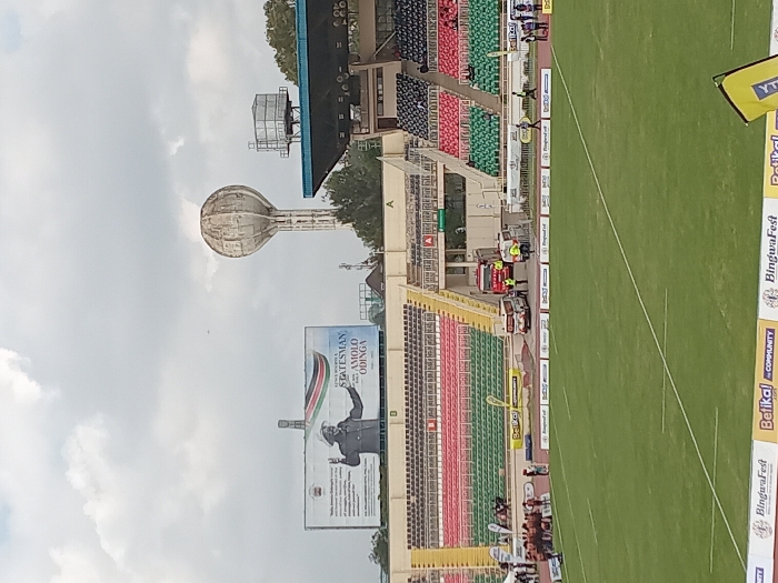 An outdoor shot captures a stadium with colorful seating and a lush green field. A large billboard featuring a political figure stands tall. A water tower punctuates the skyline near the stadium's infrastructure. Emergency vehicles are parked near the seating area, while people gather at the field's edge. Signage with "Betika" and "BingwaFest" is visible along the sidelines.
