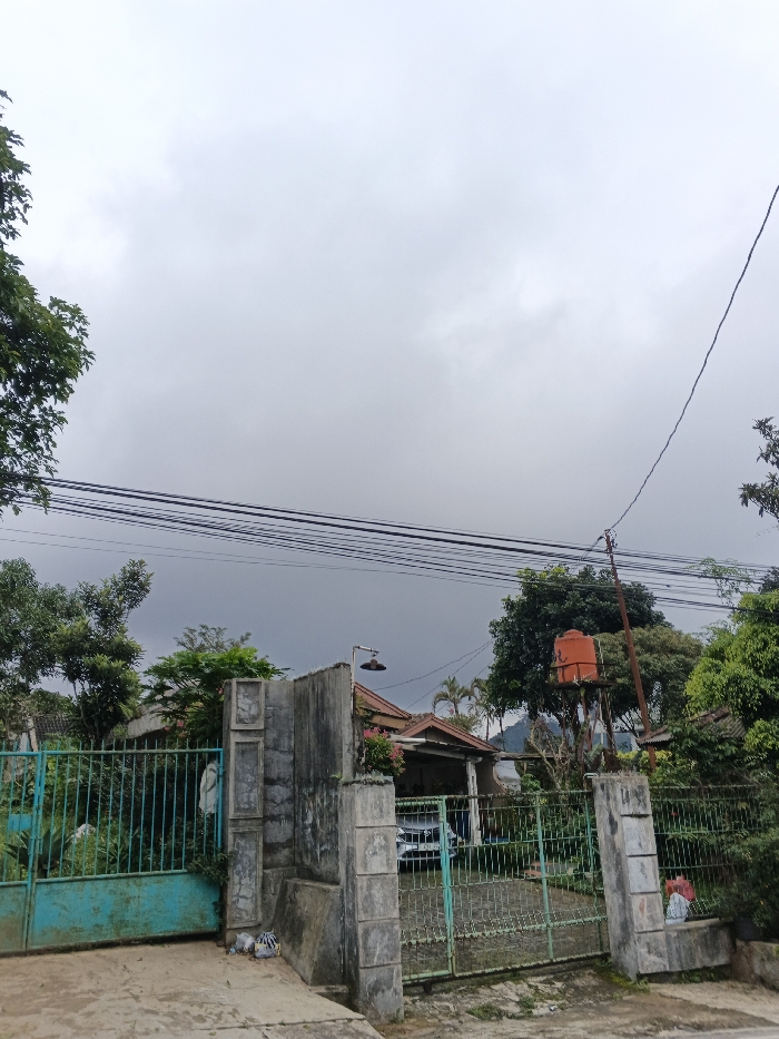 A static, wide-angle daytime photograph taken in Шчыткавіцкі сельскі Савет, Belarus, displays a residential street scene under a uniformly overcast, grey sky. The immediate foreground features a concrete or paved surface. Two separate metal gates define property boundaries: a partially open teal gate on the left leading to an overgrown area, and a mostly closed green gate on the right providing access to a paved driveway. A multi-section concrete fence, constructed with block patterns, stands between and to the right of the gates, supporting a black, outward-facing street lamp. A dark-colored sedan is parked within the driveway behind the green gate. Portions of two residential structures are visible behind the fences and dense green foliage; the house on the right features an orange-tiled roof. A prominent, rusty metal tower topped with an orange water tank stands behind the right-hand house. Multiple parallel utility lines traverse the upper mid-section of the frame, with a single thicker line descending diagonally from the upper right. Abundant green trees and vegetation populate the midground and background, with faint hills discernible on the distant horizon. No individuals are present within the frame.