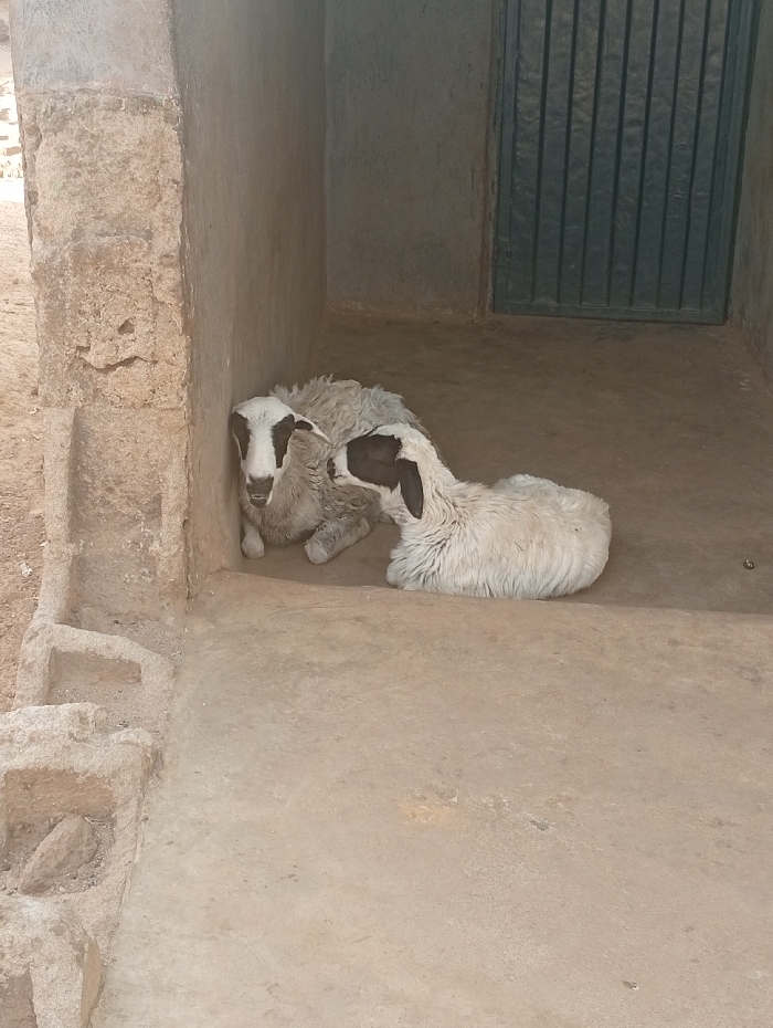 - "Two sheep rest on a beige floor inside a partially enclosed structure" by FM-2tuG03, licensed under CC BY 4.0