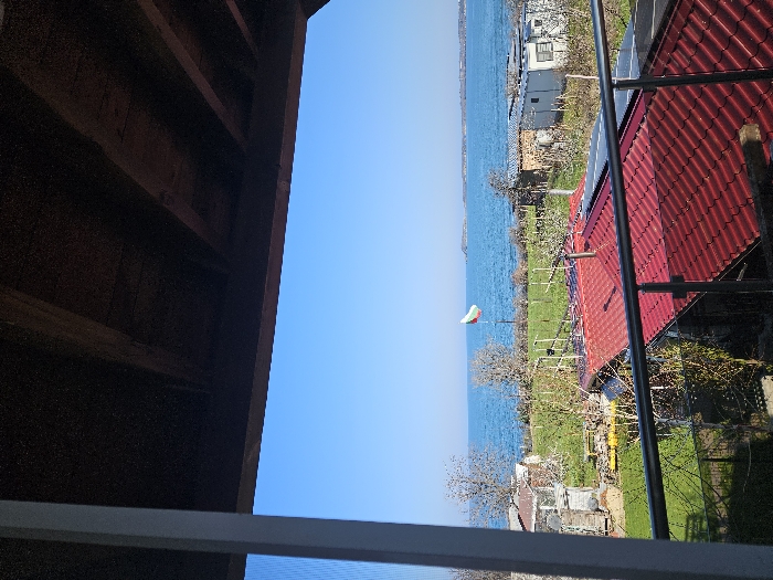 The image captures a static, elevated view of a coastal landscape in Atiya, Bulgaria, under clear daylight conditions. The perspective is from a structure, likely a balcony or porch, framed by a dark wooden ceiling with exposed beams overhead and a light-colored vertical architectural element on the left. A metal railing, featuring horizontal bars and vertical supports, extends across the lower portion of the frame. In the midground, a building with a red corrugated tiled roof is prominent, displaying multiple photovoltaic solar panels and a chimney. Surrounding this building are uneven parcels of green grass interspersed with bare deciduous trees and shrubs. Several small, utilitarian structures are present: a concrete block shed with a corrugated roof is visible to the left, adjacent to a yellow object of indeterminate function, and a light-colored rectangular structure with a darker roof is situated to the right. A Bulgarian national flag, characterized by horizontal white, green, and red stripes, is mounted on a pole near the shoreline, slightly left of the central axis. The background features a broad expanse of calm, blue sea, meeting a cloudless, uniformly blue sky on the horizon. Distant landmasses or islands are visible in the far background. No individuals, actions, or interactions are discernible within the frame.
