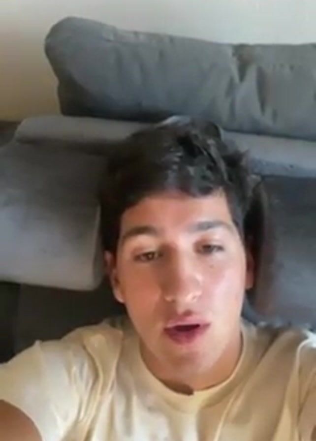 A young man is lying on a gray couch, looking directly at the camera. He has dark hair and light skin. He is wearing a light-colored t-shirt with a graphic on it. He appears to be startled, as he opens his mouth wide and makes a noise. The background is a plain, light-colored wall.