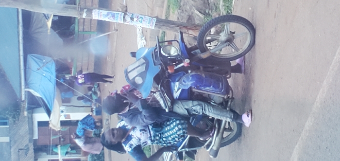 The scene depicts a bustling outdoor market area in Mua ward, Kenya, with a blue motorcycle and its two occupants prominent in the foreground