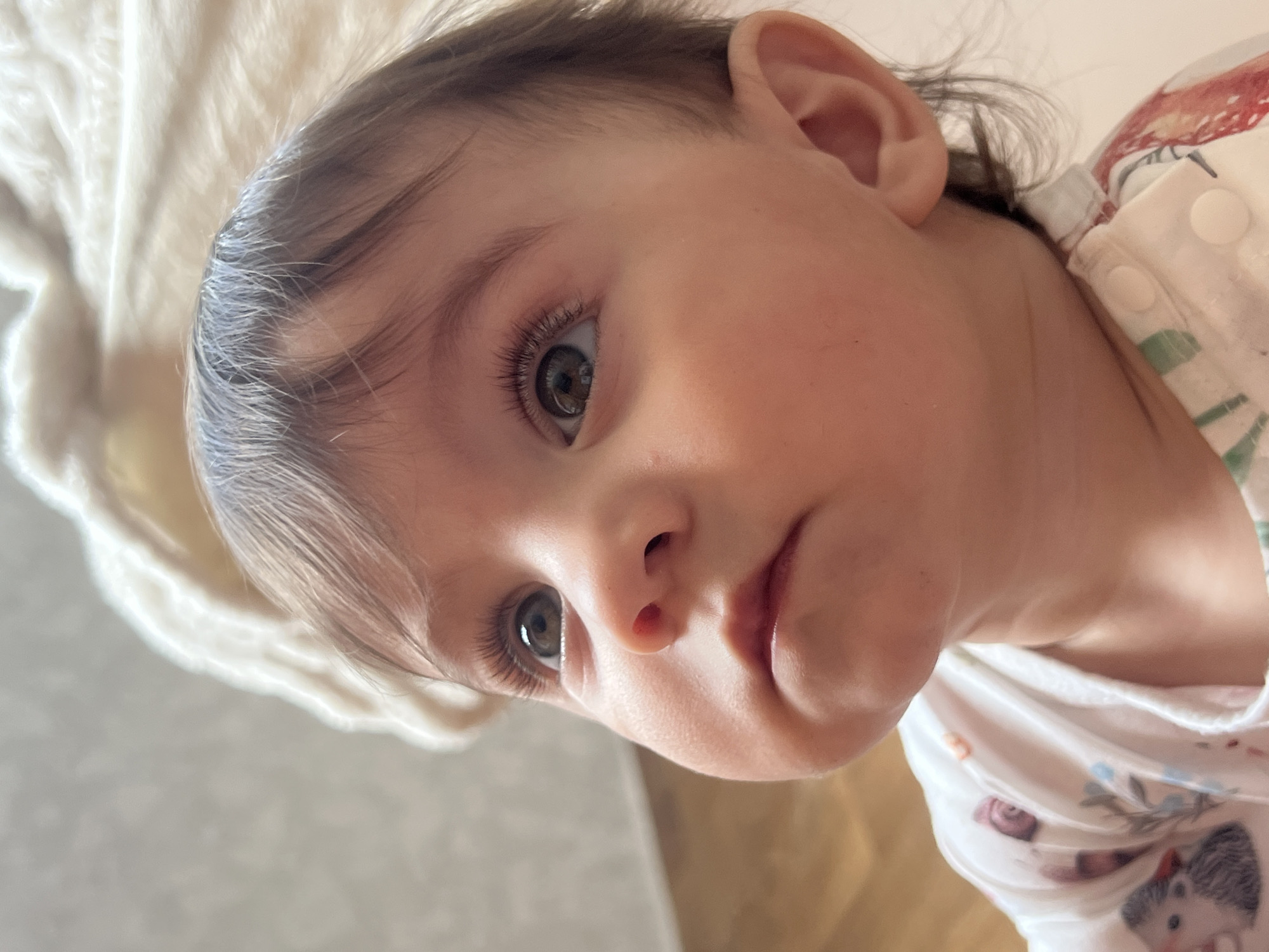 The image depicts a baby situated in what is identified as the city of Elena, Bulgaria. The baby, appearing to be an infant, is captured in a close-up, chest-up view, with the head slightly tilted back and the gaze directed upwards and slightly to the right. Facial features include light skin, dark brown hair, blue-grey eyes with prominent long eyelashes, a small nose, and a closed mouth with full lips. The baby is wearing a white garment, likely a onesie or top, patterned with colorful images, including a hedgehog and floral designs. White snap fasteners are visible on the garment's shoulder. The background is out of focus, featuring a light-colored, textured fabric, possibly a blanket or cushion, in the upper right, and a blurred light-brown surface, potentially flooring or furniture, to the lower left.