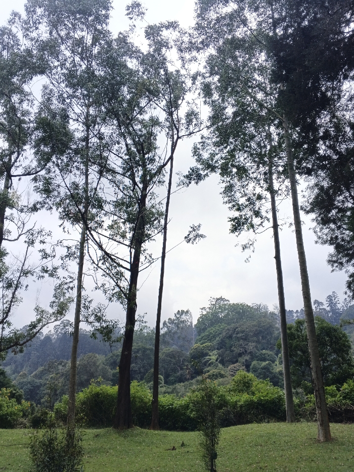 Tall, slender trees dominate the scene, their canopies reaching towards a cloudy sky