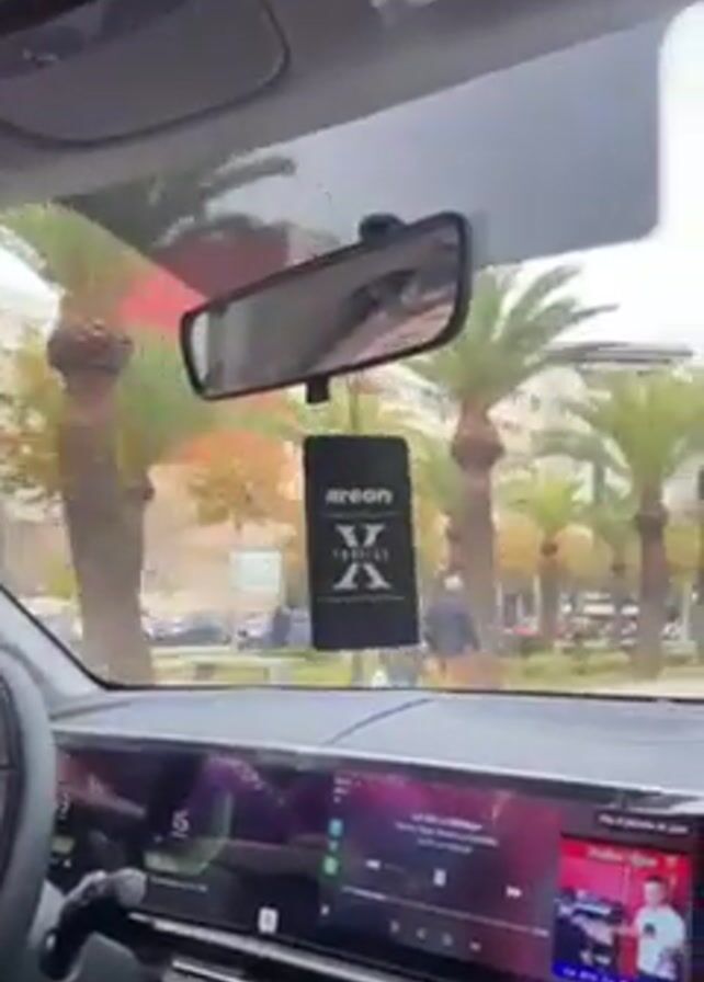 car driving down a street lined with palm trees. In the foreground is the car's dashboard, which displays music information. Through the windshield, we see traffic, including a scooter with two people on it wearing helmets and red sweatshirts, a couple of white vans, and parked cars. A few people are walking along the sidewalk. The sky is overcast. An air freshener hangs from the rearview mirror inside the car.