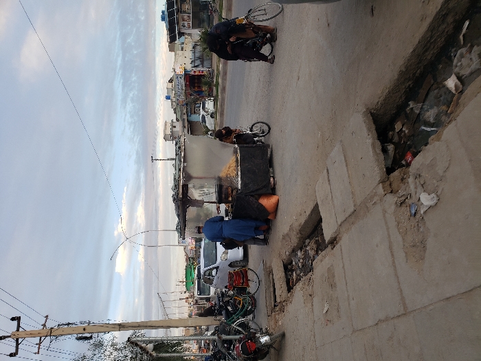 The image depicts an urban street scene in Kandahar, Afghanistan, under an overcast sky. In the foreground, a concrete sidewalk, cracked and uneven, runs parallel to the road. An open drainage ditch, partially covered by concrete slabs, contains dark liquid and various debris including plastic bags and refuse. Mid-ground, a makeshift food stall constructed with a metal frame and translucent coverings is positioned on the edge of the road. Behind the stall, a male individual wearing a blue tunic and a cap is observed, facing away from the camera, engaged with items on the stall's counter, which displays golden-brown food items. An orange sack rests on the ground near the stall. To the right of the stall, a small figure, possibly a child, crouches next to a small bicycle. Further right, two individuals clad in dark, heavy clothing are crouched over a bicycle on the roadway. One individual appears to be interacting with the bicycle's components. In the background, a white sedan is parked behind the food stall on the road. Multiple motorcycles and bicycles are parked on the sidewalk to the far left. A tall wooden utility pole, supporting numerous electrical wires, stands prominently on the left side. Beyond the immediate street level, multi-story buildings with visible shopfronts line the road, and additional utility poles and overhead wires are discernible. The overall environment suggests a bustling, utilitarian street with evident wear and infrastructure limitations.