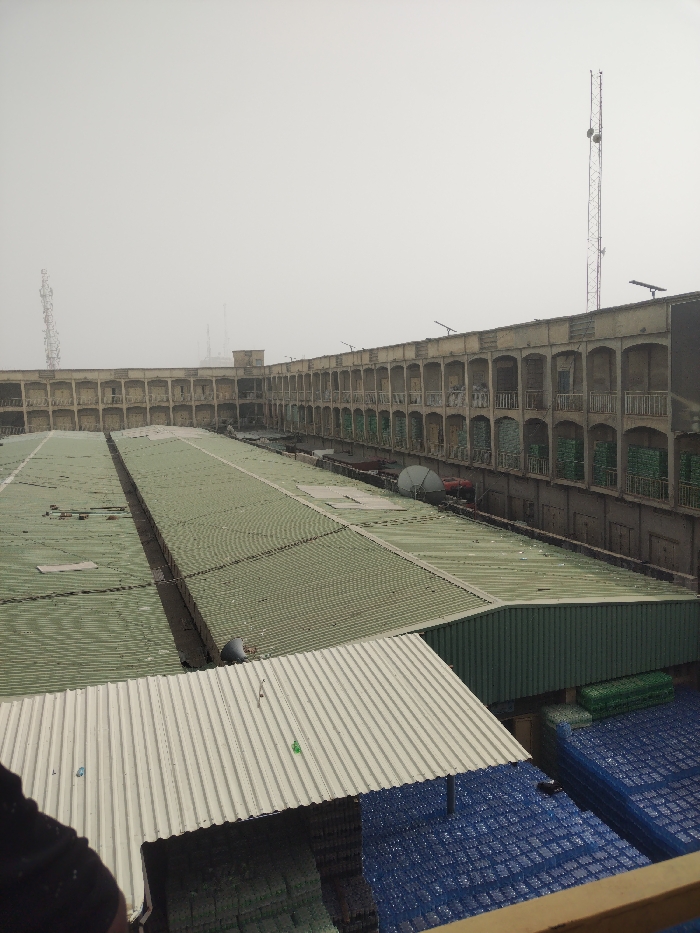This image presents an elevated, wide-angle view of a large commercial or industrial compound located in Fagge C, Nigeria, under a hazy, overcast sky. The foreground features a partial view of a dark shoulder/arm in the bottom left, indicative of the photographer's position. Below this, sections of white and dark green corrugated metal roofs are visible, beneath which large, tightly packed stacks of transparent bottles, covered by blue and green tarpaulins or netting, are stored. The mid-ground is dominated by an expansive area of interconnected buildings with numerous green corrugated metal roofs, arranged in parallel long sections. A small, white satellite dish is mounted on one of these roofs. Encircling this central roofed area is a long, multi-story concrete building characterized by a repetitive architectural design featuring numerous arched openings and balustraded balconies or loggias on at least two visible levels. Inside these openings, additional green objects, possibly stacked goods or crates, are discernible. Small, dark fixtures, likely lighting or surveillance equipment, are attached along the top edge of this perimeter structure. In the background, against the hazy sky, several communication towers are present, with a prominent tall lattice tower featuring multiple antenna dishes located on the right side of the frame. No discernible individuals or specific actions are visible within the depicted scene.