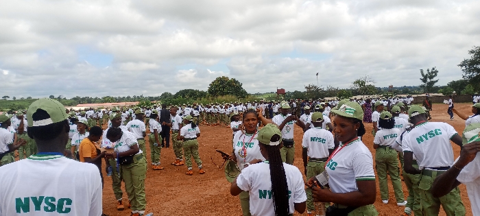 The image captures a large outdoor gathering of approximately several hundred individuals on an unpaved, reddish-brown dirt field in Peyer, Nigeria. The sky is predominantly overcast with patches of brighter cloud. The majority of subjects are observed wearing a uniform consisting of white t-shirts with "NYSC" printed in green, olive-green caps featuring a Nigerian flag emblem, and olive-green trousers. Many individuals wear lanyards with identification cards around their necks. Subjects in the foreground are standing and engaged in casual interactions; one female subject in uniform, positioned centrally, faces the camera with a slight smile, holding sunglasses and a cap in her left hand. Another female subject to her right also looks towards the camera. The crowd extends densely into the background, where distant green foliage, scattered trees, and indistinct low-rise structures are visible.