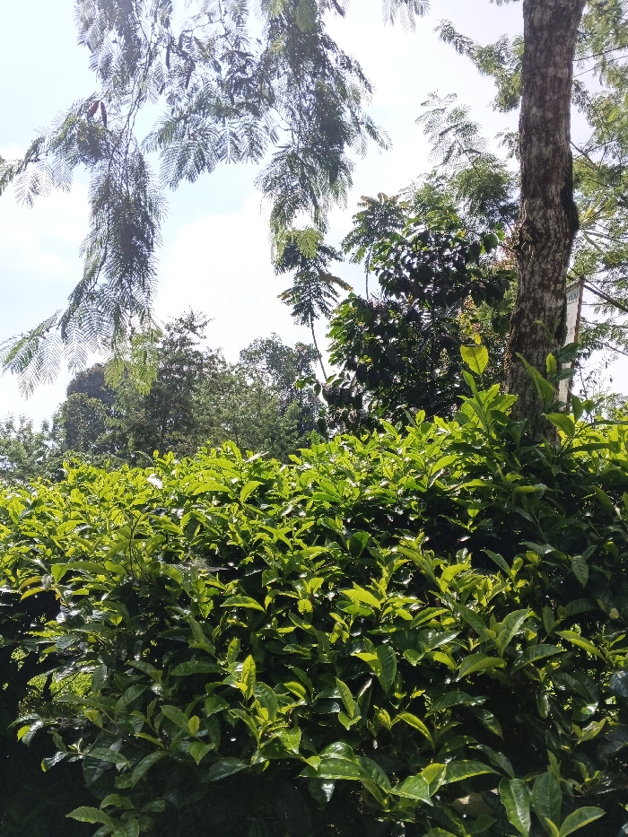 Lush green foliage dominates the foreground, possibly a tea plantation