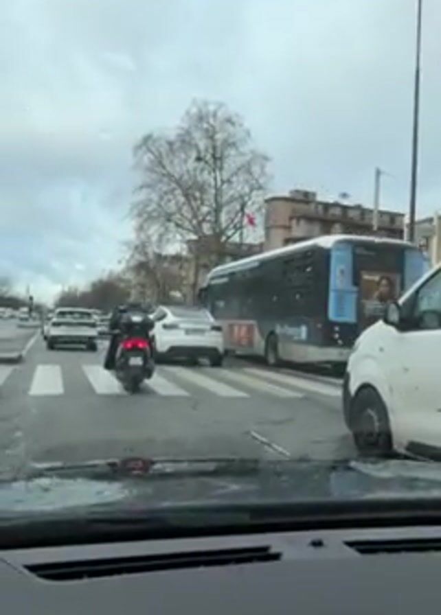 The view from inside a car shows traffic at a city intersection on a cloudy day. A white Tesla is stopped at a crosswalk next to a blue city bus. A person on a red scooter is positioned in front of the Tesla. A white sedan is visible further back in the opposite lane. The camera is likely mounted on the car's dashboard. The scene appears to be in Europe based on the vehicles and architecture. A French flag is seen on top of a building in the background. The windshield is slightly dirty.