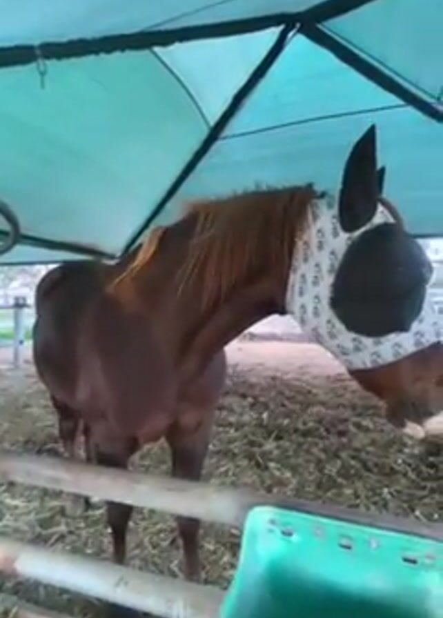 two brown horses in a pen with a green tarp overhead. One of the horses is wearing a white eye mask with black circles over the eyes. The pen is made of metal bars and is covered in hay. A green bucket sits near the fence. The camera moves around to show the horses from different angles.