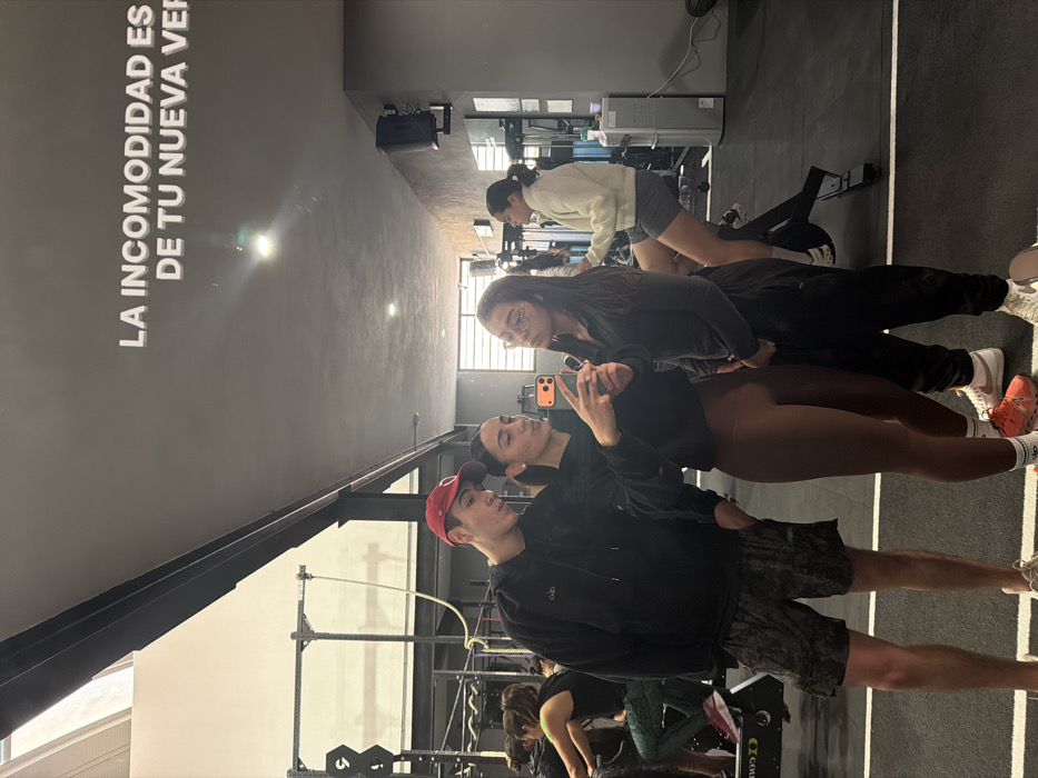 The image depicts three young adults posing for a mirror selfie inside a gym located in San Bernardino Tlaxcalancingo, Mexico