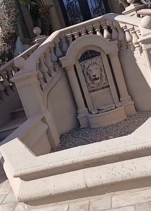 exterior of a large, opulent house on a sunny day. The house is white with beige trim and features arched windows with dark frames and wrought iron details. Two small palm trees flank the entrance. A decorative stone staircase with a lion's head fountain leads up to the entrance. The stairs are made of light-colored stone with ornate balusters. Vines climb up the walls of the house. The ground is paved with square stones.