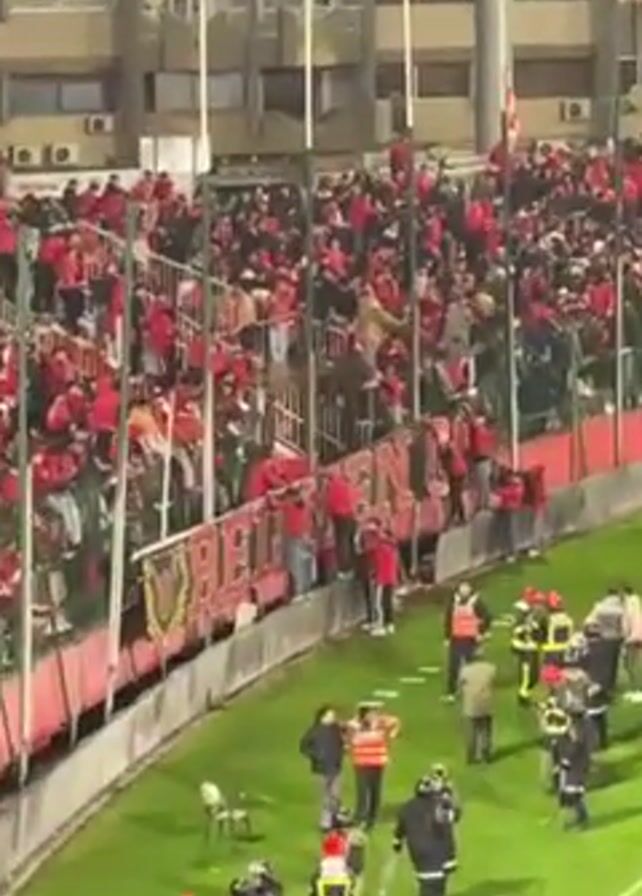 crowded stadium with a section of fans dressed in red, standing behind a barrier. There are people climbing on and over the barrier. The field below has several people, including security personnel in black uniforms and other figures in high-visibility vests and helmets. The setting appears to be a stadium during a sporting event or celebration, with a large building visible in the background. There's movement among the crowd, and the presence of security suggests potential crowd control or management activity.