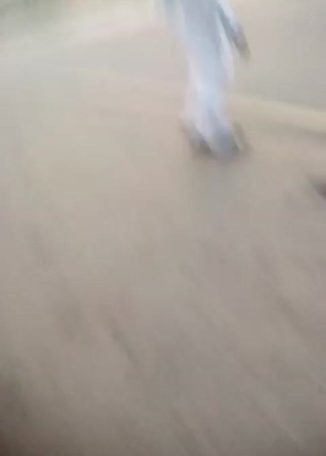 The video depicts an urban street scene with a person wearing a white outfit and brown shoes walking along the sidewalk. The person is carrying something in their left hand. The road next to the sidewalk has a yellow line marking the edge. The pavement has some dark stains on it. A motorbike passes by in the background, and there are buildings and greenery visible across the street. The camera appears to be moving along the sidewalk. The lighting suggests it's daytime or early evening.
