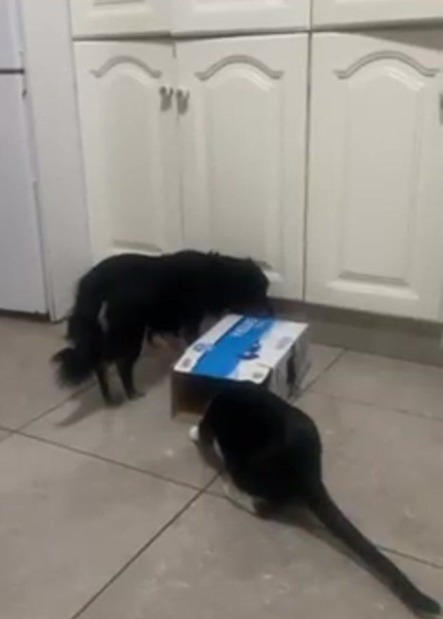 - "In a well-lit kitchen with white cabinets and tiled flooring, a black dog and a black and white cat are focused on a small cardboard box" by FM-uxU7C3, licensed under CC BY 4.0