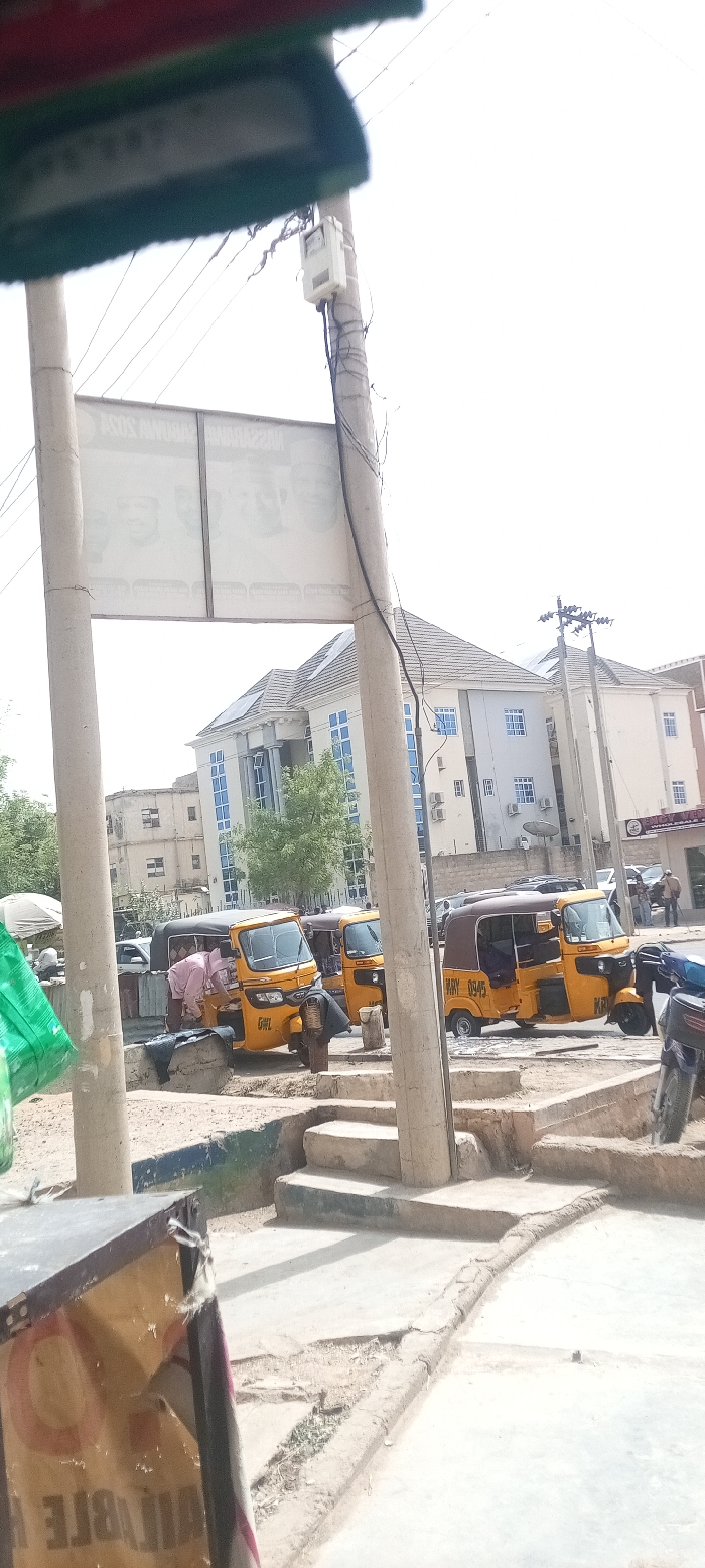 The image depicts a street scene in an urban environment, location Unknown, Unknown. In the foreground, a blurred object partially obscures the lower left corner, followed by a concrete sidewalk with multiple steps and a curb. Two large concrete utility poles stand centrally, supporting an overhead billboard displaying faded political portraits and text, including "SADAUANA SOKO" and "HASSANANA." An electrical meter box and numerous tangled wires are attached to the right pole. Three yellow and brown tricycles, identified as Keke Napep or Bajaj RE vehicles, are prominent in the midground. The leftmost tricycle, bearing "GHL" markings, is actively being attended to by an individual in a light-colored shirt and dark trousers, who is bent over its engine compartment. A second "GHL" tricycle is parked nearby. A third tricycle, marked "WAY 0945" and "KAY," is parked further right. A blue and black motorcycle is partially visible on the far right. The ground around the tricycles and poles is a mixture of dirt and concrete. In the background, a prominent multi-story building features a light-colored facade, blue-tinted windows, and a grey tiled roof, with a large entrance supported by pillars. To its right, another multi-story building with white windows and satellite dishes is visible. Other structures are discernible further in the background. The sky is bright and hazy, and numerous overhead power lines crisscross the upper portion of the frame. A green plastic bag is visible on the far left.