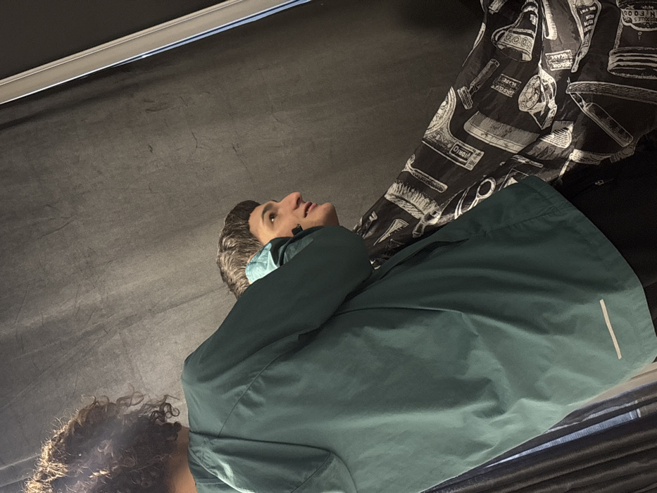 Two individuals are depicted in an indoor setting within the city of Ostwald, France. In the foreground, an individual with curly brown hair, viewed from behind, wears a dark green hooded jacket featuring a reflective strip near the lower hem. This person is positioned behind a second individual, who is seated and facing right. The seated person has short brown hair, wears a light blue collar, and is draped in a black and white barber cape patterned with various barbershop tools, including razors, brushes, and scissors. This individual displays a slight smile and looks slightly upwards and to the right. The background consists of a dark, textured wall, with a narrow vertical silver-colored frame visible along the right edge of the image. A dark, possibly curtained, element is partially visible on the far left. The arrangement suggests the person in the green jacket is attending to the hair of the seated individual.