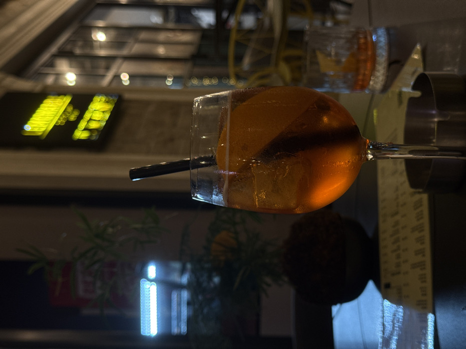 The image depicts a nighttime scene at a bar or restaurant in Rafailovići, Montenegro. In the foreground, a stemmed glass holds an orange beverage, consistent with an Aperol Spritz, garnished with an orange slice and containing ice cubes and a black straw. Condensation is visible on the glass surface. To the immediate right of the glass on a dark table is a silver-toned ashtray. To the left, a partially visible menu or document with text and a dark, spherical decorative plant are present. The blurred background reveals an out-of-focus second glass containing an orange drink, yellow outdoor seating, various ambient lights, and an illuminated sign on a building facade that appears to spell out "GEMINI BAR."