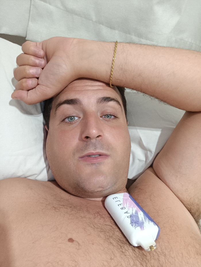A man lies on his back, a white pillow behind his head. He has light skin, blue eyes, and dark hair. His right arm is raised, his hand resting on his forehead, adorned with a gold bracelet. A white and purple vape pen sits on his chest. He has noticeable chest hair. The man appears to be looking directly at the camera.