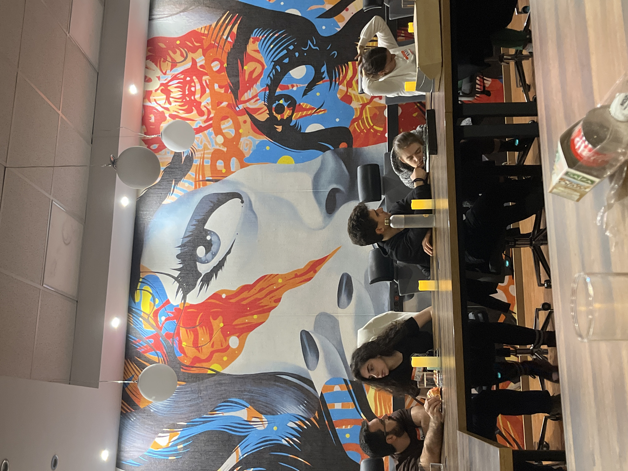 **Location:** The scene is located at Skapto Izzi on bul. "Vasil Levski" in Sofia, Bulgaria. **Description:** The image captures the interior of the restaurant with a distinct feature being the large, colorful mural on the wall depicting a woman's face with artistic, abstract elements. A long communal wooden table stretches through the frame, with multiple people seated along it. **People:** A group of approximately six individuals are visible. Some are engaged in conversation, while others appear to be looking at their phones or lost in thought. The details of their clothing are generally dark colored. **Objects:** A wooden table is central. Also, glass water bottles and drinking glasses are on the table. There is a ceiling with recessed lighting and decorative spherical hanging lamps near the mural. **Actions:** People are sitting at the table, seemingly socializing. Some are using their phones. **Interactions:** The photo implies a social gathering or group meal.