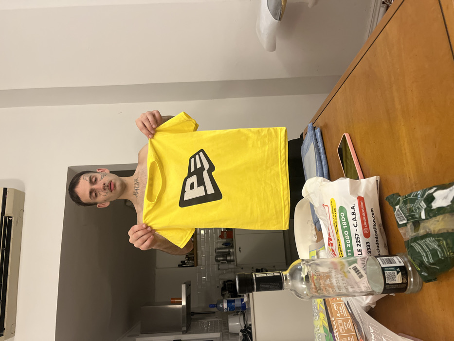 A man with facial tattoos displays a yellow t-shirt with a black logo. The scene is indoors, possibly a kitchen, with a wooden table cluttered with various items, including an empty bottle, food packaging, a pink cell phone, and cleaning supplies. A shopping bag with "ciudadcotillon.com" printed on it suggests a party supply store. The background reveals kitchen appliances.
