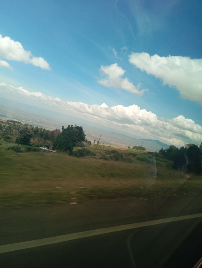 The image depicts an expansive natural landscape within the Lari/Kirenya ward, Kenya, observed from a low-angle perspective. The bottom third of the frame is occupied by a dark, reflective surface showing a prominent horizontal light-colored line, exhibiting motion blur consistent with an image captured from a moving vehicle. The midground features sloped terrain covered predominantly in green and brown grasses, interspersed with clusters of trees. A small, light-colored structure, possibly a building, is partially visible on the left, set amongst the vegetation. Faint indications of vertical utility poles are present in the right-midground. The background extends to a broad, hazy plain, with distant hills or mountains forming a silhouette against the horizon. The sky, comprising the upper two-thirds of the image, is bright blue with scattered white cumulus clouds. A dense horizontal band of white cumulus clouds is prominent along the distant horizon. No individuals or explicit human actions are discernible.