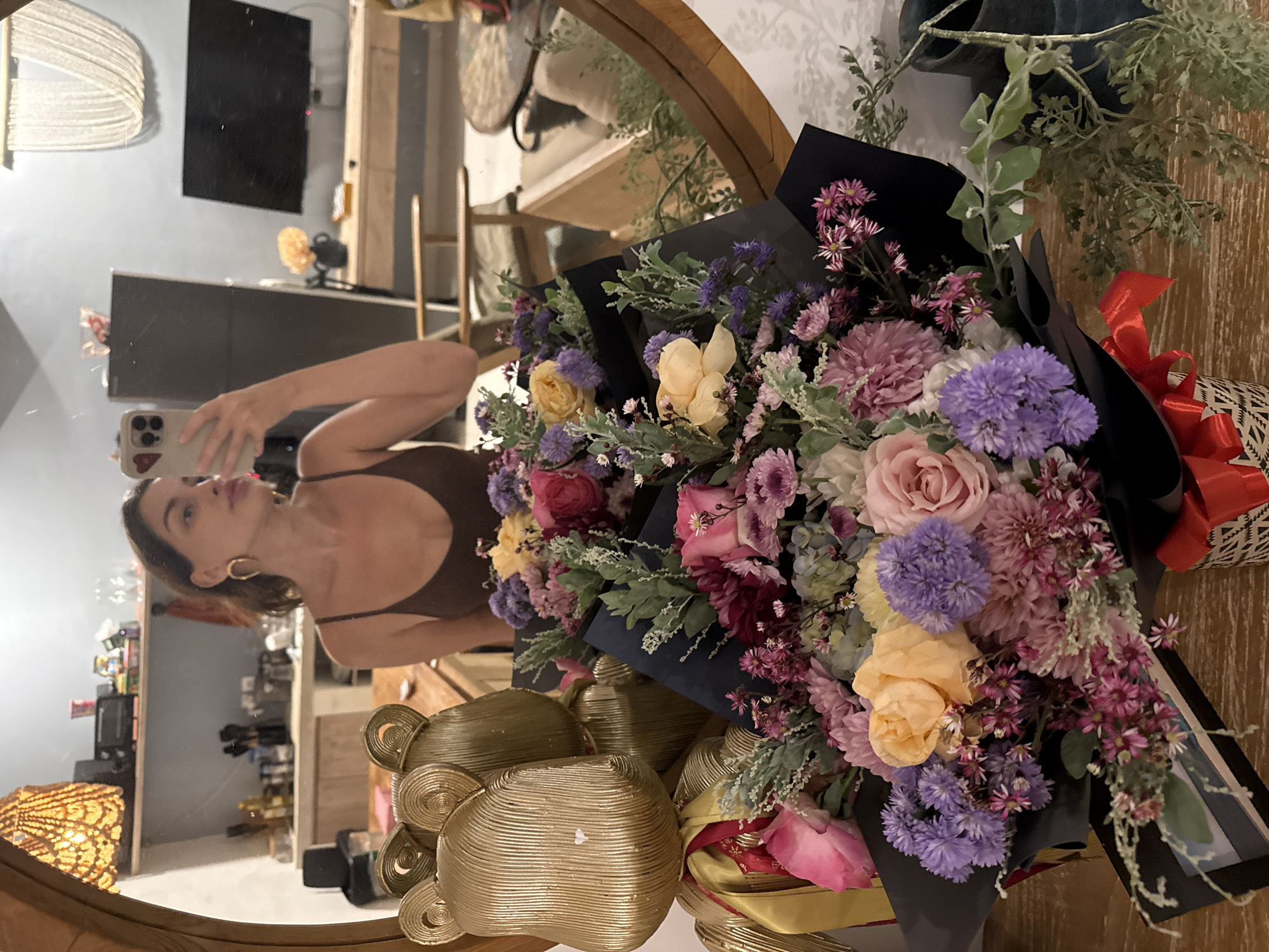 A selfie captures a woman in a mirror, likely in North Kuta, Indonesia. The reflection reveals her holding a phone, wearing a brown tank top, and gold hoop earrings. The mirror, framed with wood, reflects a room with a television, furniture, and lighting. In the foreground is a large, colorful bouquet of flowers wrapped in black paper with a red ribbon and decorative gold teddy bear figures.