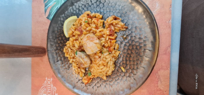 A close-up, overhead view depicts a serving of a rice dish in a restaurant setting. The dish, presented on a dark, hammered metallic plate, consists of orange-hued rice mixed with red diced vegetables, green herbs, and approximately three large, pale, cooked meat or seafood pieces. A yellow lemon wedge garnishes the right side of the plate. The plate rests on a textured, reddish-orange surface, identified as a placemat, with a partial visible brand name "CHIDO" on the left side, indicating the location as El Chido Mexican Restaurant in Kifisia, Greece. A dark brown cylindrical object, likely a table leg or decorative element, stands vertically in the background. A portion of a green leaf pattern is visible on the right, and the background beyond the table is a light grey wall. No people, actions, or interactions are visible.