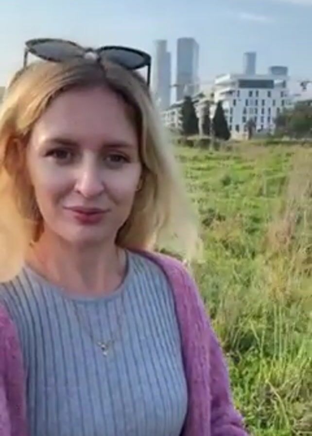 A woman with blonde hair, wearing a gray ribbed shirt and a pink cardigan with sunglasses on her head, is holding a phone and filming herself. She is looking directly into the camera with a slight smile. Behind her, there is a field of green grass, with taller brown grasses intermixed. In the distance, there are modern buildings, including several tall skyscrapers. The sky is light blue with some scattered clouds. The camera moves slightly as the woman walks.