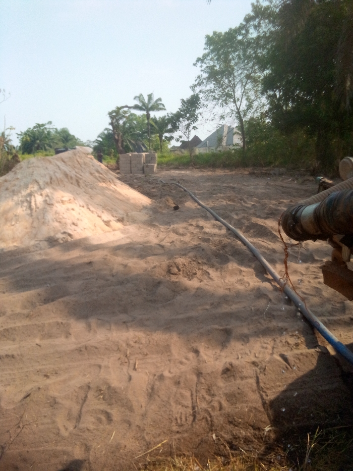 The image depicts an outdoor scene in an unconfirmed urban or peri-urban area within Unknown, Unknown, consistent with a construction or land development site. The foreground features sparse green and brown vegetation along the bottom edge, transitioning into a vast expanse of light brown, disturbed sandy ground that covers most of the lower half of the frame. On the left side of the midground, a substantial pile of light-colored sand rises, displaying indentations or patterns on its surface. To the right of this sand pile, a dark-colored hose or pipe extends horizontally across the sandy ground, leading towards the right edge of the frame. At the extreme right, partially visible, is a section of industrial equipment, likely a pump or engine, with a larger pipe connected to it. Drops of liquid, possibly water, are evident near this connection point, suggesting recent or ongoing operation. In the background, behind the sand pile, a neat stack of grey, rectangular concrete blocks is visible. Further into the background, dense green foliage, including several palm trees and other deciduous trees, forms a natural boundary. A structure with a light-colored, angular roof and darker walls is partially observable amidst the trees on the right side of the background. The sky overhead is bright and clear, indicating daylight conditions. No individuals are clearly identifiable within the scene.