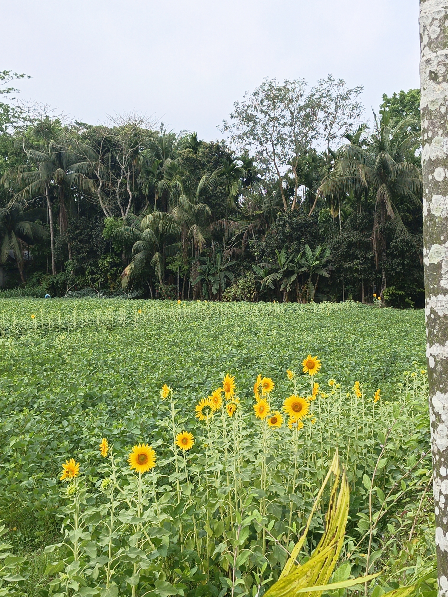 A field of sunflowers in Unknown, Bangladesh, displays rows of green plants, with mature sunflowers interspersed throughout. A tree trunk with mottled bark stands on the right. In the background is a dense line of trees including palm trees. The sky is overcast.
