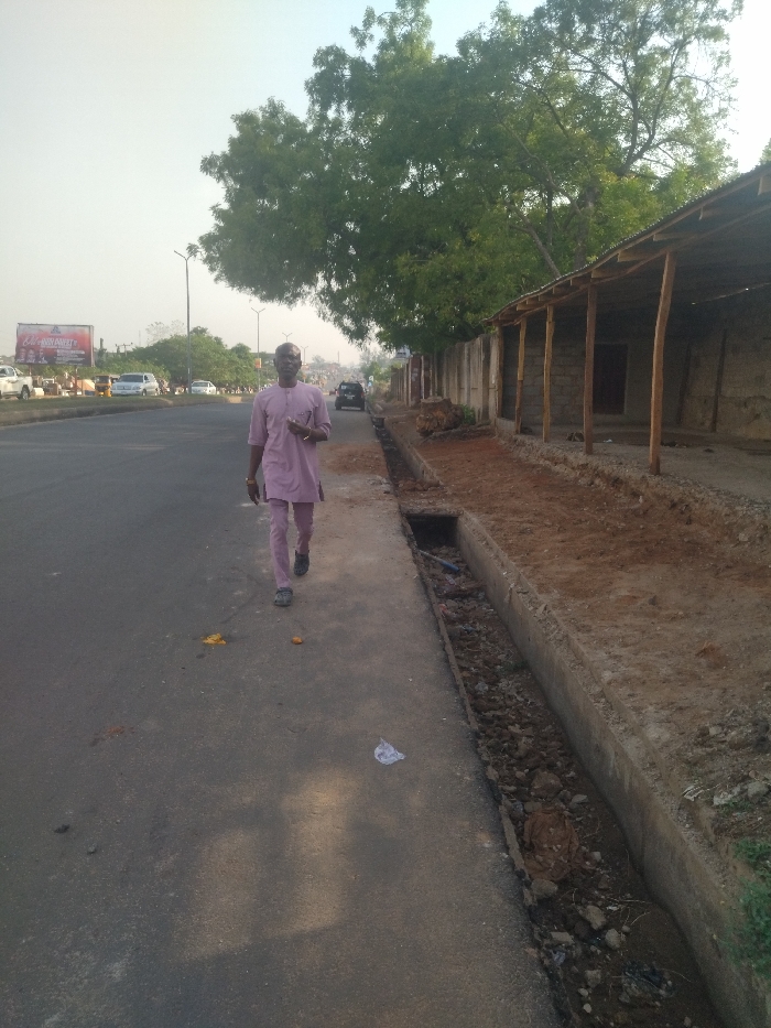 The image depicts a man in a pink long-sleeved shirt and pants walking on a paved road in New Karu, Nigeria