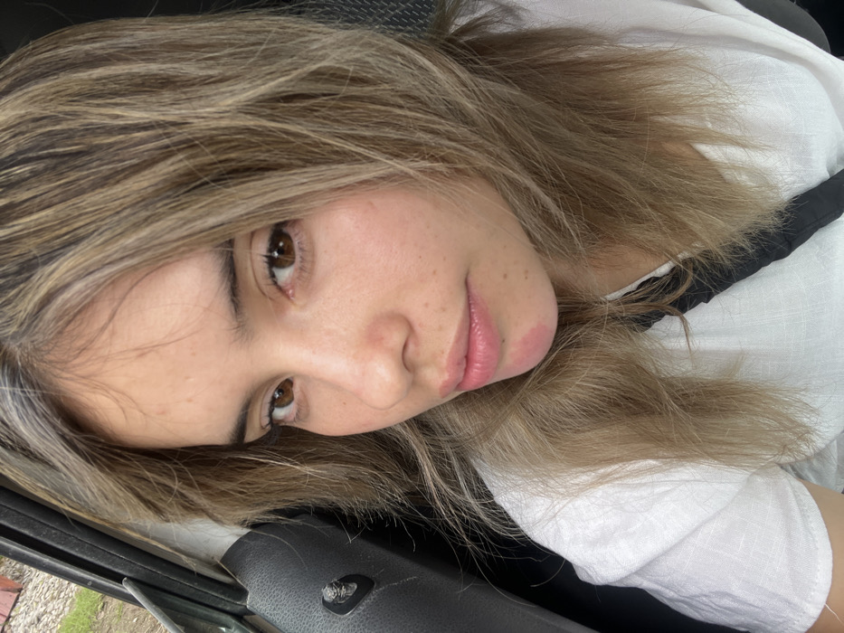 A woman with highlighted blonde hair, fair skin, and brown eyes is seated inside a vehicle