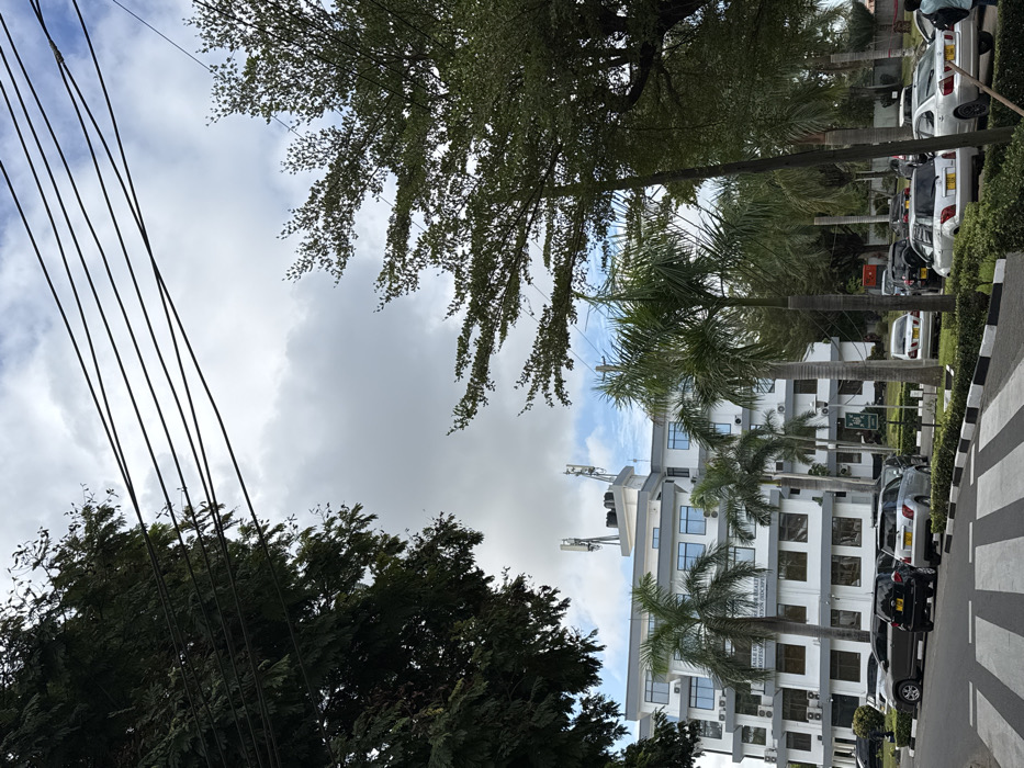 An outdoor scene shows a multi-story white building with palm trees. Cars are parked along the side. Utility poles and wires are visible on the left side of the frame, with trees framing the top and bottom. The sky is cloudy with patches of blue. The viewpoint is from street level, looking upward. A crosswalk is in the foreground.