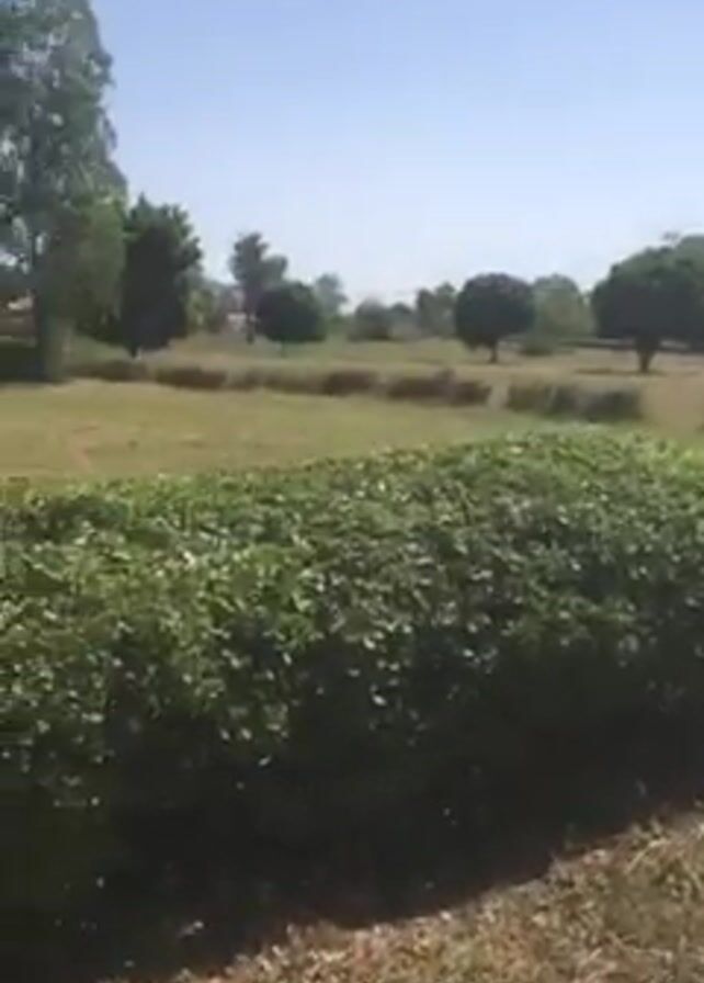 The video depicts a sunny outdoor scene with various trees and shrubs. The foreground features a low hedge with dry grass and a paved edge. In the background, a grassy field stretches towards a line of trees, including palm trees. A few buildings are visible in the distance. The sky is clear and blue. The camera pans slowly across the landscape.