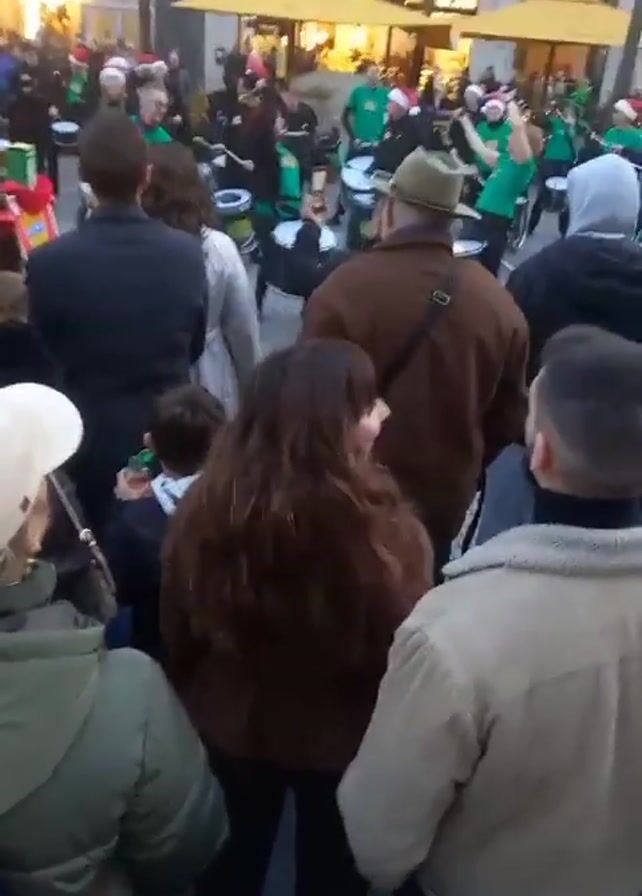 The video captures a street performance in an urban setting. A crowd has gathered, mostly seen from behind, to watch a drumming group. The drummers are wearing green shirts and Santa hats, suggesting a Christmas-themed performance. They are playing large drums, some mounted on wheeled carts, creating a lively atmosphere. The crowd is diverse in terms of age and attire, indicating a wide range of interest in the performance. The background reveals storefronts and buildings decorated with holiday lights, enhancing the festive ambiance. The camera appears to be held by a spectator moving slightly through the crowd to get a better view.