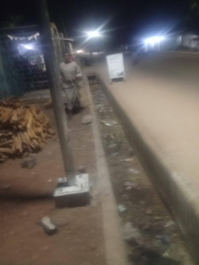 A nighttime street scene reveals a man in light clothing walking along the sidewalk. To the left, a pile of sticks or wood rests near a utility pole. A sign is partially visible on the right edge of the road, illuminated by streetlights. A concrete drainage ditch runs along the sidewalk, filled with debris. The image is blurry, obscuring details.