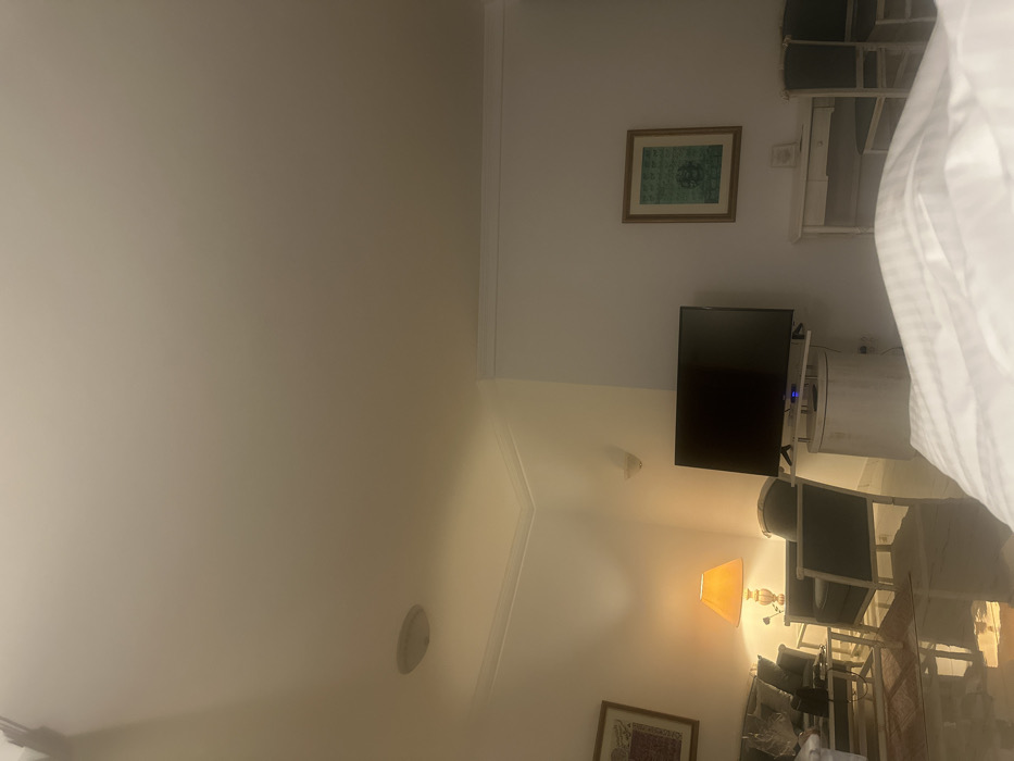 A dimly lit room features a wall with an indiscernible painting, a television mounted above a lit lamp, and a wall vent. An open-shelved cabinet is against the opposing wall, adorned with a framed print above it. A bed with white linens occupies the foreground, partially obscuring the view. Chairs are next to the cabinet.
