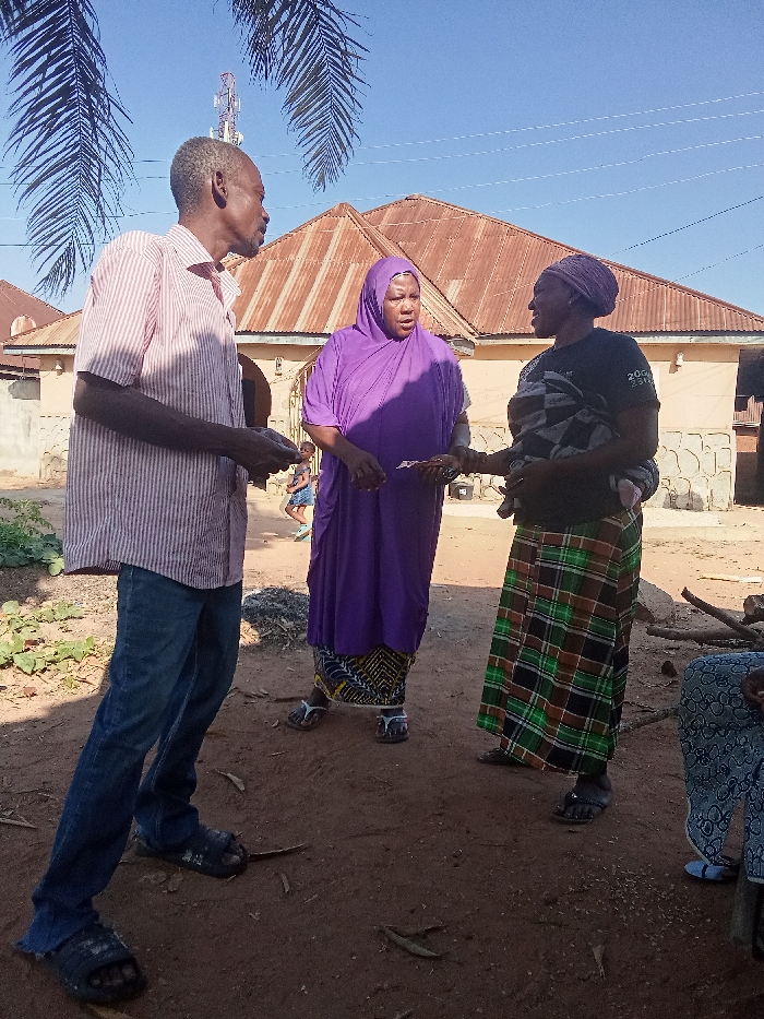 The image captures an outdoor scene in Akwanga, Nigeria, featuring three adults and an infant on a reddish-brown dirt ground under a clear blue sky