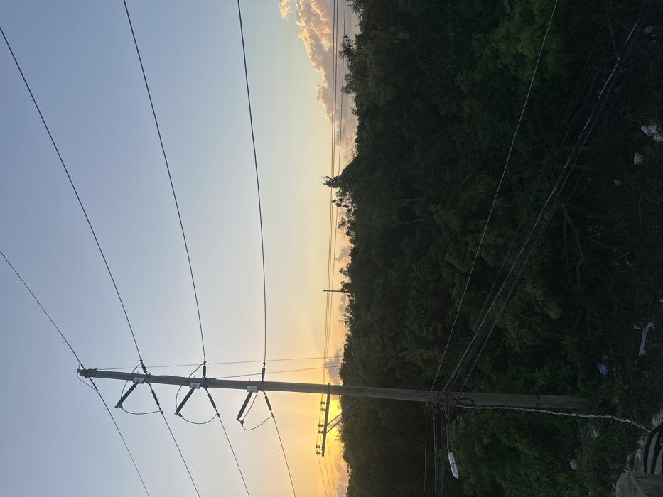 The image depicts an outdoor scene at sunrise or sunset in Higüey, Dominican Republic. A weathered wooden utility pole, equipped with three sets of insulators supporting multiple electrical wires, dominates the foreground, positioned slightly left of center. Several dark electrical and communication lines extend horizontally across the frame, both high and low. In the midground and background, dense, dark green tropical foliage, consisting of numerous trees and bushes, covers the landscape. To the left, a distant utility pole structure is silhouetted against a bright, low sun emitting a yellow-orange glow, which transitions into a light blue sky overhead. White cumulus clouds are visible in the upper right quadrant. The base of the main utility pole shows a tangled mass of wires, and the ground below it, partially obscured by foliage, contains visible litter, including white plastic debris. No human figures are present.