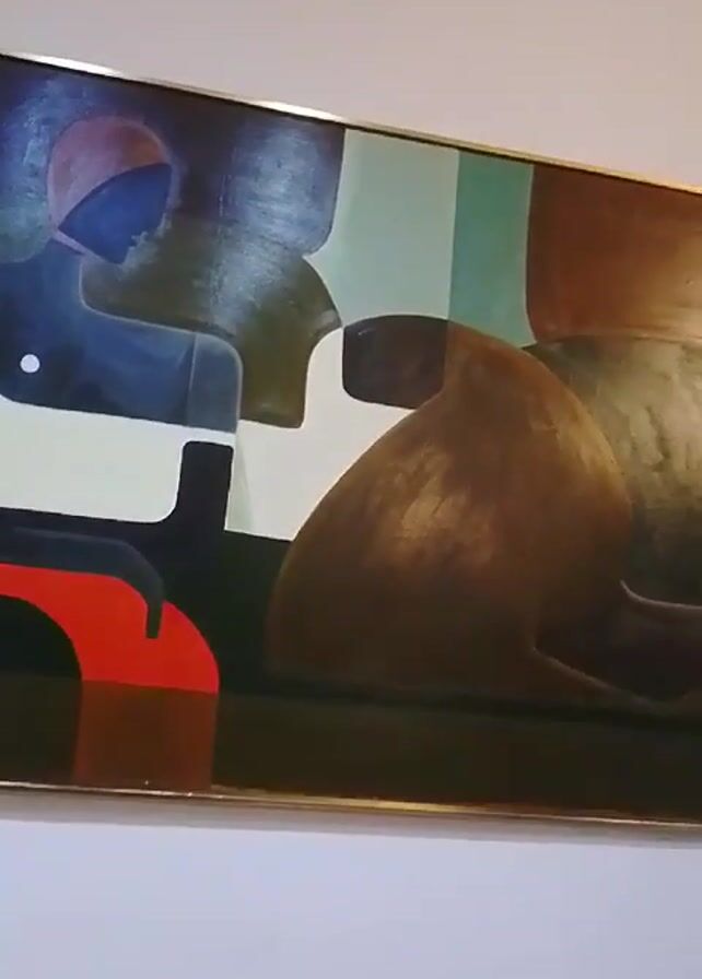 close-up of an abstract painting hanging on a white wall. The painting is in a gold frame and features a variety of geometric shapes in colors such as red, blue, green, brown, and white. A voice says, "Look at these paintings. So fine."